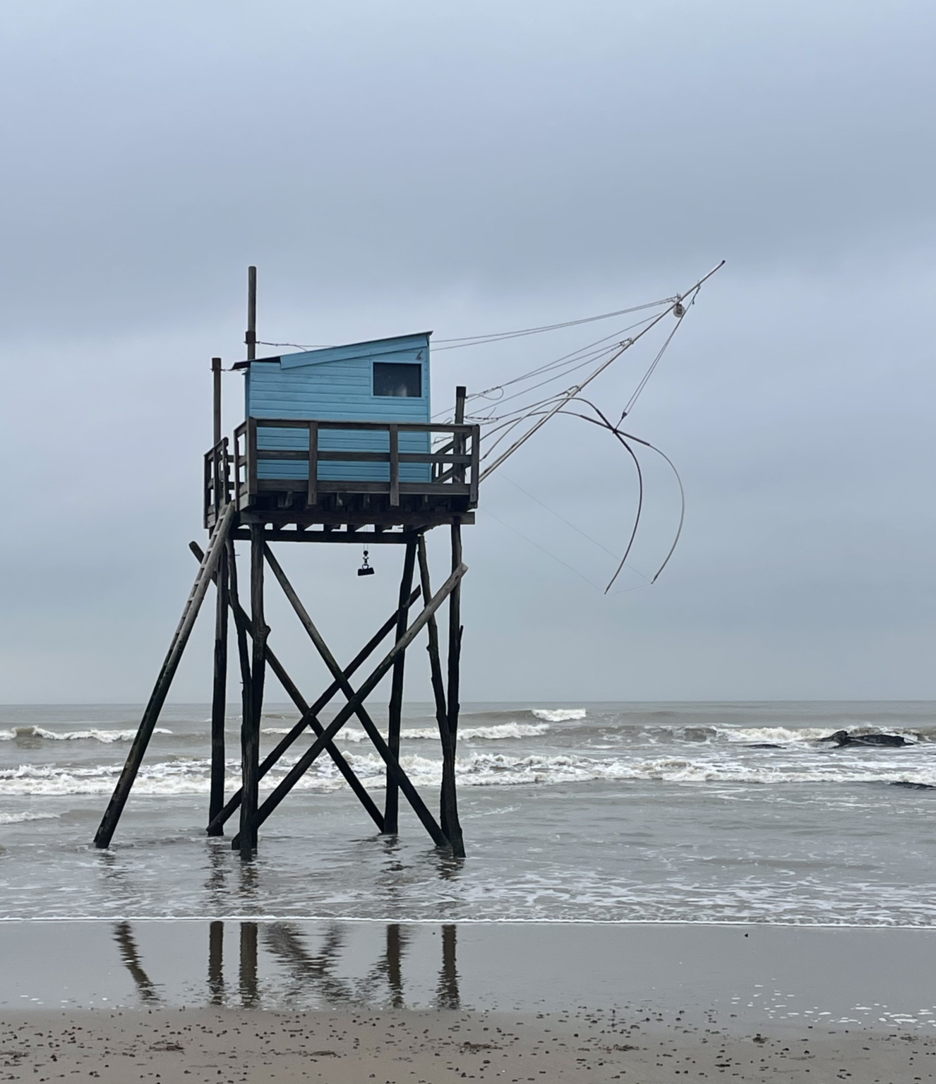 Sur la plage, qui s’étend sur une large palette de gris et de brun, avec quelquefois, furtivement une lueur rosée dans les rigoles laissées par le retour de marée, la mer peint des huiles métalliques, des moirés fragmentaires. Des coquillages brisés dans leur forme semblent de minuscules mosaïques, remontant des profondeurs de sable. Des chemins nacrés d’huitres et de brisures de couteaux de mer se dessinent, crissant sous les semelles. Puis le sable revient à lui-même, gris et beige, parfois fort sous le pas, parfois d’un moelleux de presque vase. Par endroits, des douves subsistent, rêves de château de sable, formes en creux de souvenirs enfuis.